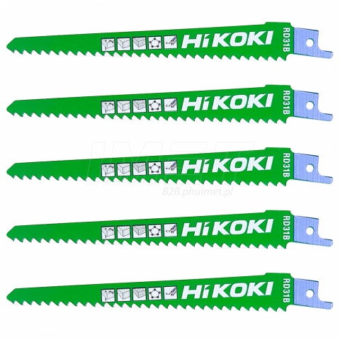 Zestaw 5 brzeszczotów do drewna + metal HiKOKI RD31B / 752025, ostrza wykonane są z bimetalu (połączenie stali węglowej z HSS). Dzięki czemu są wyjątkowo elastyczne i wytrzymałe, umożliwiają szybkie cięcie w drewnie zawierającym nieutwardzone wkręty metalowe oraz gwoździe. Brzeszczoty posiada uniwersalny uchwyt pasujący do urządzeń następujących marek: AEG, Black&Decker, BOSCH, DeWalt, Fein, Flex, Hilti, Makita, Metabo, Milwaukee, Porter Cable, Ridgid, Rothenberger, Ryobi, Skil oraz innych marek.