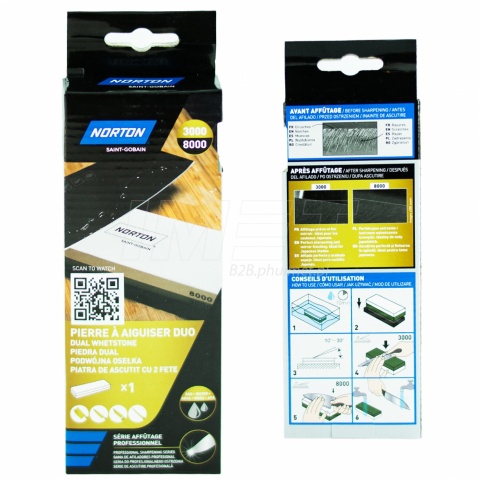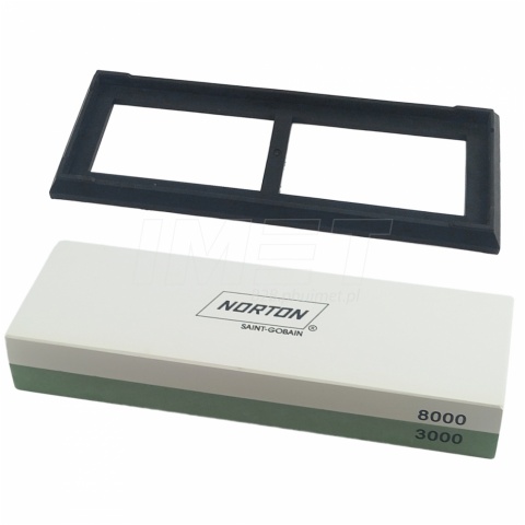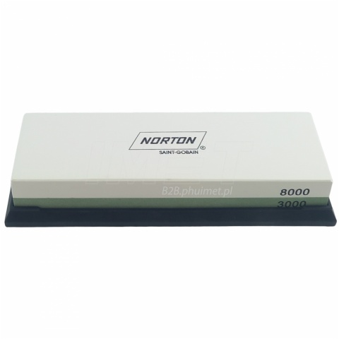 Osełka dwustronna o gradacji P3000 / P8000 przeznaczona jest do naprawy i usuwania niedoskonałości. Gradacja P3000 odpowiada za uzupełnienie efektów ostrzenia na kamieniu o gradacji 1000 dzięki nim uzyskamy nóż o ostrej, gładkiej i równej klindze. Gradacja P8000 odpowiada za osiągnięcie naprawdę ekstremalnie ostrych noży. Wykorzystuje się je do finalizowania całego procesu ostrzenia. Ich powierzchnia jest gładka, dlatego nie służą do ostrzenia, ale do polerowania ostrza, co nadaje nożom niewiarygodną ostrość (przeznaczone dla pasjonatów i profesjonalistów). Przed użyciem osełki należy zanurzyć ją w wodzie, aby zapewnić płynne ostrzenie. Nie ma potrzeby kupowania drogich olejków, ponieważ woda smaruje kamienie. Podczas użytkowania osełki wymagają minimalnego nacisku i w ciągu kilku minut zauważalna jest poprawa ostrza. Wszystkie osełki Norton posiadają antypoślizgową podstawę, która zapobiega ich przemieszczaniu się podczas ostrzenia i maksymalizuje bezpieczeństwo użytkownika. Osełki są oznaczone kolorami ziarna, aby wybór był szybki i łatwy. Po zakończeniu ostrzenia należy umyć kamień, aby pozbyć się zgromadzonego na powierzani urobku w wyniku ostrzenia.