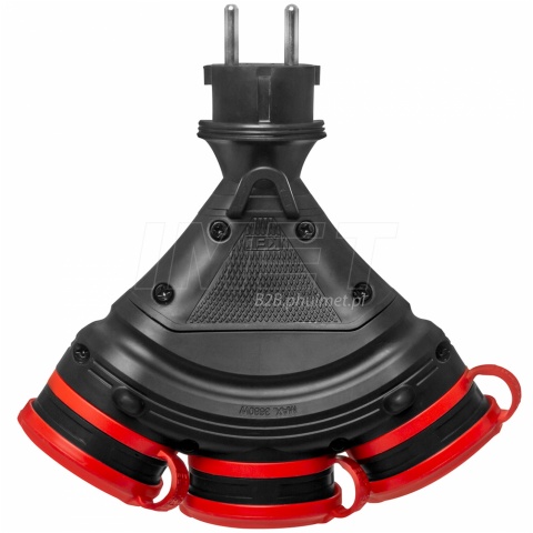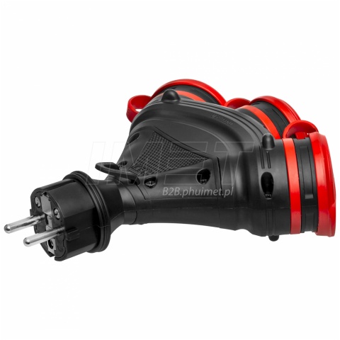 Potrójny rozgałęźnik przenośny z klapkami hermetycznymi i uziemieniem, IP 54 (bryzgoszczelne) rozbieralne, czarne z czerwonymi klapkami, wyposażony we wtyczkę z uziemieniem. Extrem to seria gniazd i rozgałęźników przeznaczonych do pracy w najbardziej wymagających warunkach. Wysoki stopień bryzgoodporności zapewnia ochronę przed wnikaniem kurzu, brudu i piasku oraz strumieniem wody z dowolnego kierunku (IP54). Produkty są odporne na uderzenia, uszkodzenia mechaniczne oraz wytrzymałe na nacisk. Wysokiej jakości tworzywa techniczne użyte do wytworzenia produktów gwarantują im trwałość i niezawodność niezależnie od miejsca, w którym będą używane. Produkty Extrem znajdą szerokie zastosowanie w przemyśle, na budowach, statkach, w fabrykach, wszędzie tam, gdzie niezbędne jest solidne połączenie i bezpieczne złącze.