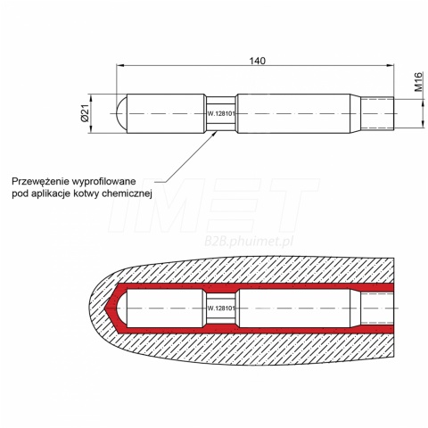 Kotwa pod zawias regulowany do bramy i furtki M-16 o średnicy fi 21mm i długości 140mm