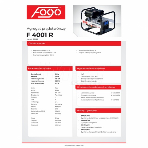 Agregat prądotwórczy FOGO F4001R wyposażony w rozruch ręczny. Idealnie sprawdzi się przy zasilaniu awaryjnym: w domu, w biurze, na kempingach, w urządzeniach przemysłowych, a także na łódkach i jachtach. Zastosowany w agregacie silnik marki Rato zapewnia dużą niezawodność oraz wysoką wydajność pracy. Gumowe stabilizatory i poduszki silnika agregatu zapewniają tłumienie drgań i zmniejszają hałas. Agregat jest wyposażony w układ automatycznej regulacji napięcia AVR, pozwalający w dużym stopniu wyeliminować niekorzystne wahania napięcia, które mogą być niebezpieczne dla wielu nowoczesnych i delikatnych urządzeń.