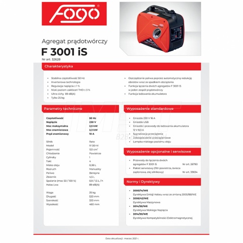 | Przenośny, bardzo cichy, inwertorowy lekki agregat prądotwórczy FOGO F3001IS o mocy znamionowej 2.3kW i mocy maksymalnej 2.5kW, wyposażony w elektroniczny regulator napięcia AVR na prąd jednofazowy, stanowi uniwersalne źródło energii zapewniające bezpieczeństwo i komfort pracy w różnych warunkach. Dzięki niezawodności i jakości zasilania, agregat umożliwia zasilanie urządzeń elektronicznych, szczególnie wrażliwych na spadki napięcia i częstotliwości, takich jak komputery, sprzęt medyczny czy urządzenia pomiarowe. Agregat F3001IS posiada funkcję ładowania akumulatora oraz możliwość łączenia dwóch jednostek w jeden zespół prądotwórczy. Wyposażony jest w gniazda: 230V, 12VDC (do ładowania akumulatora) oraz gniazdo USB. Przy obciążeniu 75%, spalanie wynosi około 1.1 l/h. Agregat znajduje zastosowanie w różnych miejscach, takich jak mieszkania, domy, kampingi, przyczepy campingowe, działki, warsztaty, miejsca publiczne, grille, rekreacja, drobne budownictwo, komputery, odbiorniki elektryczne, małe elektronarzędzia, a także jako oświetlenie awaryjne. Zastosowanie technologii inwertorowej pozwala na stabilne dostarczanie energii elektrycznej, niezależnie od zmiany obciążenia i prędkości obrotowej silnika. Elektroniczny konwerter eliminuje amplitudę napięcia wejściowego na wyjściu. W odróżnieniu od tradycyjnych generatorów, wykorzystuje generator stałego magnesu i układ sterowania prędkością silnika, co skutkuje znacznym zmniejszeniem zużycia paliwa i hałasu przy średnich obciążeniach.