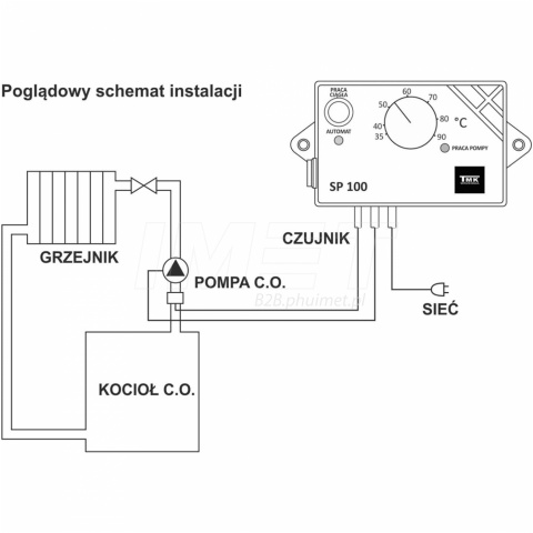 Elektroniczny sterownik SP 100 jest urządzeniem przeznaczonym do automatycznego załączania i wyłączania pompy obiegowej c.o. Sterownik może być stosowany do pomp w instalacjach c.o. z kotłem opalanym paliwami stałymi lub gazem. Sterownik załącza pompę, gdy temperatura osiągnie nastawioną na skali wartość. Po wygaśnięciu kotła pompa obiegowa wyłącza się i dzięki temu grzejniki pozostają dłużej ciepłe, a zużycie energii jest mniejsze.