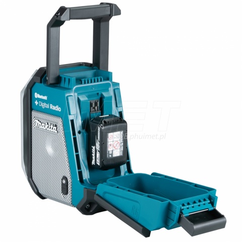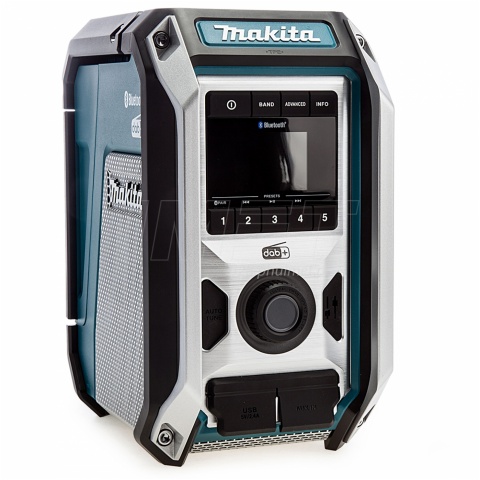 Odbiornik radiowy Makita DMR115 to bardzo wytrzymałe urządzenie przeznaczone do pracy w trudnych warunkach. Wytrzymała obudowa tłumiąca wszelkie drgania, oraz zabezpieczająca urządzenie przed wstrząsami sprawdzi się praktycznie w każdym miejscu narażonym na kurz, wilgoć i upadki. Idealne rozwiązanie na każdej budowie lub w warsztacie. Urządzenie posiada wygodną rączkę z wbudowaną anteną, podłączenie zewnętrznego dźwięku (AUX - Minijack), Bluetooth oraz wyjście do zasilania urządzeń USB. Możliwość odbioru stacji radiowych FM lub DAB/DAB+. Odbiornik radiowy Makita DMR115 obsługuje wszystkie akumulatory systemów CXT 10.8V - 12V Max, LXT 14.4V oraz najpopularniejsze LXT 18V, ma też możliwość pracy z zasilacza sieciowego, który jest dołączony w komplecie. Odbiornik radiowy Makita DMR115 nie obsługuje akumulatorów z serii G 14.4V, serii G 18V, LXT 7.2V i LXT 10.8V oraz akumulatorów Ni-Cd i Ni-Mh. Urządzenie do pracy nie wymaga akumulatorów, może być zasilane z zasilacza, który jest dołączony w zestawie.
