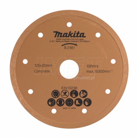 Tarcza diamentowa pełna 125 x 20mm na mokro Makita B-21951 | Tarcza diamentowa pełna 125 x 20mm Makita B-21951 to wysokiej jakości tarcza diamentowa przeznaczona do cięcia na mokro materiałów takich jak beton, cegła betonowa, krawężnik, dachówka cementowa, marmur, dachówka wypalana bez szkliwa, cegła, dachówka gliniana oraz płytki. Tarcza ta ma średnicę 125 mm oraz otwór o średnicy 20 mm, maksymalna prędkość obrotowa wynosi 15300 obr./min oraz 100 m/s, co podnosi wydajność i precyzyjne cięcie przy minimalnej emisji hałasu. Szerokość segmentu wynosi 1,9 mm, a wysokość segmentu to 5,5 mm, co zapewnia tarczy dużą wytrzymałość oraz długą żywotność. Tarcza ta jest przeznaczona do cięcia na mokro, co zwiększa wydajność oraz minimalizuje ilość kurzu. Tarcza diamentowa pełna 125 x 20 mm Makita B-21951 to idealne rozwiązanie dla profesjonalistów, którzy wymagają wydajnego, precyzyjnego i trwałego narzędzia docięcia różnych materiałów. | | Typ tarczy: | Diamentowa pełna | | Średnica tarczy: | 125mm | | Średnica otworu: | 20 mm | | Wysokość segmentu: | 5,5 mm | | Grubość segmentu: | 1,9 mm | | Zastosowanie: | Do cięcia glazury, terakoty, granitu, ceramiki, gresu, kamienia naturalnego, betonu, krawężników, dachówki, marmuru | | Prędkość obrotowa: | 15300obr./min - 100 m/s | | Norma: | EN 13236 | | Kod producenta: | B-21951 | | Producent: | Makita | | EAN: | 088381401692 | | Adapter do szyny prowadzącej przeznaczony do przecinarek do płytek 4100KB / DCC500 / DCC501 Makita 198673-2 Adapter do szyny prowadzącej przeznaczony do przecinarek ręcznych do płytek Makita 4100KB, DCC500 i DCC501.