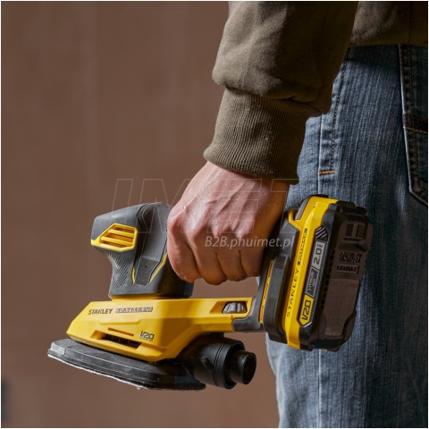 Akumulatorowa szlifierka oscylacyjna STANLEY FATMAX SFMCW221 wyposażona w stopę delta, klasyczna, jednoręczna maszyna do szlifowania wykończeniowego. Mocny i wydajny silnik generuje do 12000 oscylacji na minutę, co przekłada się do 24000 ruchów (prawo/lewo) w ciągu minuty. Szlifierka cechuje się wydajnością i znakomitą obróbką, a także łatwością użytku i solidnością wykonania. Urządzenie posiada możliwość montażu papieru za pomocą rzepu. Kompaktowe wymiary, niska waga i wygodny uchwyt zapewniają komfortową pracę. Dedykowany pojemnik na pył ułatwia utrzymanie porządku w przestrzeni roboczej, jednocześnie ogranicza wdychanie szkodliwego pyłu i kurzu. Zastosowanie zasilania akumulatorowego zapewnia dużą swobodę, brak przewodu zasilającego krępującego ruchy. Szlifierka oscylacyjna jest w pełni kompatybilna z serią akumulatorów Li-Ion V20 LITHIUM ION 18V.