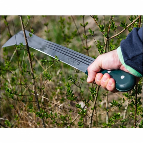 Maczeta ogrodowa 18" 15G191 VERTO to przydatne narzędzie ogrodowe ze specjalistycznym ostrzem i długiej powierzchni cięcia. Maczeta posiada całkowitą długość 455 mm. Została wykonana z hartowanego, niezwykle wytrzymałego ostrza oraz drewnianego, ergonomicznego uchwytu, pewnie leżącego w dłoni. Rękojeść mocowana jest za pomocą nitów, dzięki czemu jego trwałość jest jeszcze większa. Z pomocą maczety można sprawnie wykarczować zarośla, podciąć krzewy lub drzewka oraz okrzesać gałęzie czy konary.