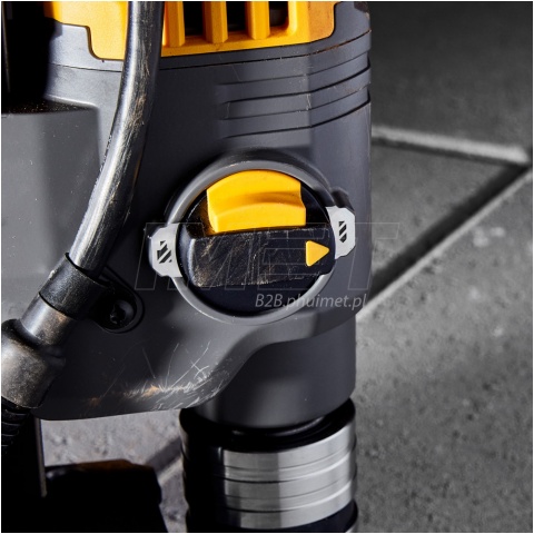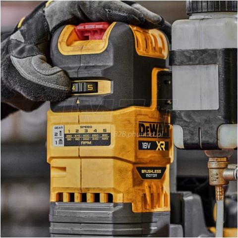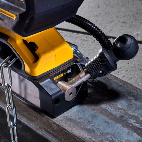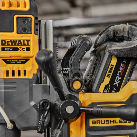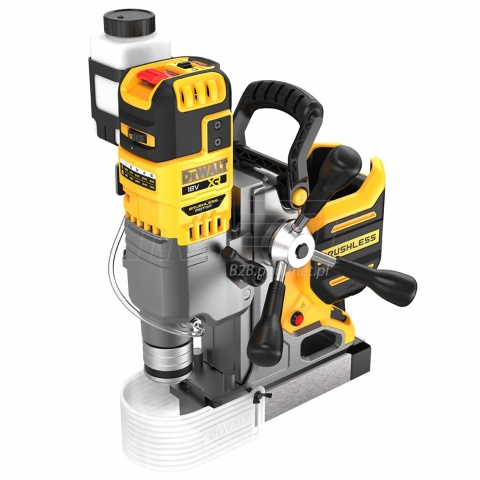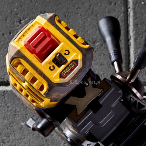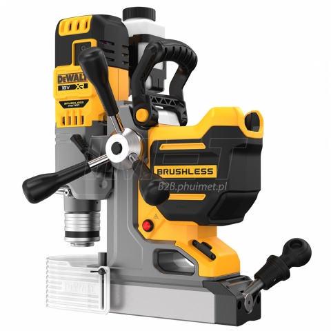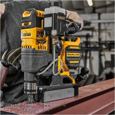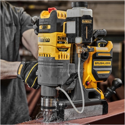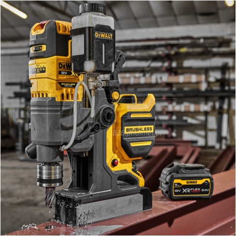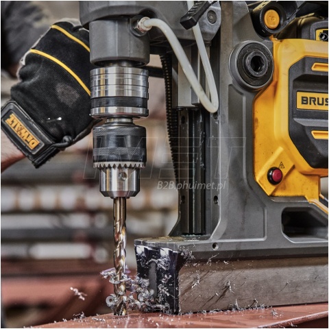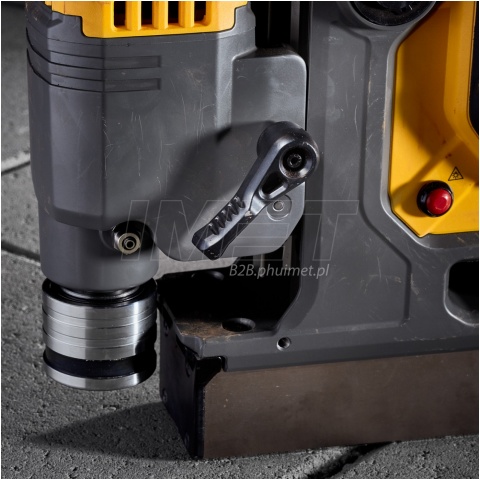 | Wiertarka stołowa DeWALT DCD1623N to akumulatorowa wiertarka magnetyczna, która jest zasilana akumulatorami 18V, FLEXVOLT oraz Power Stack. Dzięki temu narzędzie może być łatwo transportowane i używane w miejscach bez dostępu do gniazdka elektrycznego. Wiertarka posiada wydajny silnik bezszczotkowy, który zapewnia moment obrotowy do 49 Nm, oraz optymalny czas pracy na zasilaniu akumulatorowym. Urządzenie posiada regulację prędkości, która w zależności od wybranego trybu (wiertło/koronka) pozwala na uzyskanie prędkości roboczych od 130 do 810 obrotów/minutę. Wiertarka magnetyczna DeWALT DCD1623N umożliwia pracę na mokro, gdyż posiada zintegrowany zbiornik na wodę. Narzędzie jest wyposażone w magnes stały, co umożliwia wiercenie w pionie, poziomie, a nawet do góry nogami. Przełącznik prawe lewe obroty pozwala na wybór kierunku obrotów. Wiertarka posiada również zwalnianą przyciskiem, odwracalną, obrotową rękojeść posuwową, która może być przekładana na drugą stronę i mocowana bez użycia narzędzi. Maksymalna średnica wiercenia dla wierteł krętych wynosi 16mm, a dla frezów lub koronek 50mm. Wiertarka jest wyposażona w system DEWALT E-Clutch, który wyczuwa ruch narzędzia i w razie potrzeby redukuje moment obrotowy silnika do rozsądnego poziomu. W tylnej części narzędzia znajduje się pokrętło do uruchamiania elektromagnesu oraz 3 stopniowej regulacji jego mocy . Co ważne, magnes działa nawet bez akumulatora, co jest podyktowane ochroną użytkownika, a także sprzętu przed upadkiem z dużej wysokości, gdy zabraknie energii w akumulatorze. Dodatkowo, w urządzeniu zastosowano bardzo duży włącznik, który uruchamia wiertarkę przez jego wyciągnięcie. Dzięki temu, w razie potrzeby, wystarczy go wcisnąć z powrotem aby szybko wyłączyć wiertło. Wymiana akcesoriów odbywa się bez narzędzi dzięki uchwytowi Weldon 19mm. W zestawie znajduje się również głowica kluczykowa dostosowana do szybkiego montażu w uchwycie Weldon, która pozwala pracować z wiertłami o średnicy uchwytu do 16mm. Precyzję pracy wspiera dioda LED, na bieżąco doświetlająca przestrzeń roboczą. Wersja N BODY - bez akumulatorów i ładowarki w zestawie, pakowane w walizka.