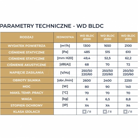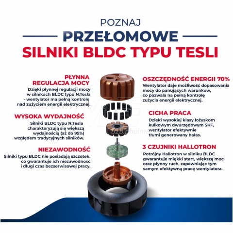 | Wentylator dachowy DOSPEL 007-9261 WD 315 wyposażono w bezszczotkowy silnik BLDC typu N. TESLA o mocy 140 W, zapewniający wydajność na poziomie 2100 m³/h przy prędkości obrotowej 2250 obr./min. Ten wydajny produkt charakteryzuje się oszczędnością energii do 70%, dzięki czemu jest ekonomiczny w użytkowaniu. Urządzenie charakteryzuje się stopniem ochrony IPX4, co oznacza odporność na zachlapanie, oraz I klasą izolacji dla zwiększonego bezpieczeństwa. Doskonale sprawdzi się w budynkach użyteczności publicznej (sklepy, bary, restauracje), magazynach, halach przemysłowych, a także budynkach gospodarczych. Konstrukcja wykonana z ocynkowanej stali pokrytej dwiema warstwami lakieru antykorozyjnego zapewnia trwałość i niezawodność w trudnych warunkach. Wentylator posiada wbudowany potencjometr umożliwiający płynną regulację prędkości oraz potrójny system czujników termicznych (40°C, 60°C, 90°C), który zapobiega przegrzaniu i przeciążeniu. Dzięki kulkowym łożyskom, model pracuje cicho, generując 72 dB(A) z odległości 3 metrów, a maksymalna temperatura pracy wynosi 70°C. Wentylator wyposażony jest w precyzyjny potencjometr oraz potrójny Hallotron gwarantujący miękki start, płynny ruch oraz większą moc. Trzy czujniki Halla zapewniają efektywną pracę wentylatora. Wyprodukowany w Polsce i oparty na polskiej elektronice. |