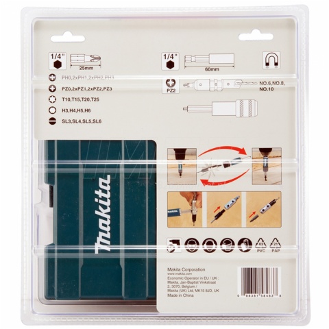Zestaw 47 akcesoriów wiertarskich Makita D-73477 oferuje bity o długości 25 mm, w tym typy Philips, Pozidriv, Torx, Hex oraz płaskie w różnych rozmiarach, umożliwiające dopasowanie końcówki do gniazda wkręta. Do zestawu dołączony jest także uchwyt do bitów o rozmiarze 1/4 cala, który pozwala na szybką wymianę i zapobiega ich wypadaniu. W komplecie znajdują się 3 wiertło - pogłębiacze przeznaczone do wkrętów o średnicach 3 / 4 / 5 mm wraz z dedykowanym szybkozaciskowym uchwytem. Wszystkie elementy są przechowywane w dołączonej walizce z tworzywa sztucznego, co zapewnia łatwą organizację i dostępność akcesoriów.