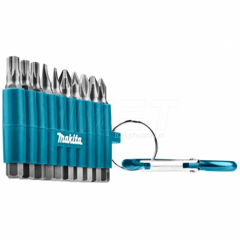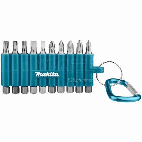 Zestaw 10 bitów Makita D-65028 o długości 50mm, w tym typy Philips, Pozidriv, Torx oraz płaskie w różnych rozmiarach, umożliwiające dopasowanie końcówki do gniazda wkręta. Cały zestaw jest umieszczony w specjalnym blistrze z karabińczykiem, który umożliwia łatwe mocowanie, na przykład do paska, szlufki spodni lub innego miejsca, co pozwala mieć bity zawsze pod ręką.