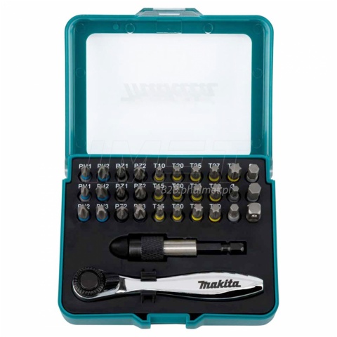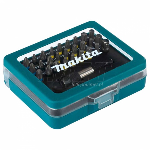 Zestaw 32 akcesoriów wkrętarskich Makita P-79790 zawiera bity o długości 25 mm, obejmujące różne typy, takie jak Philips, Pozidriv, Torx oraz hex, w różnych rozmiarach, umożliwiając dopasowanie końcówki do gniazda wkręta. Do zestawu dołączony jest również 1 szybkozaciskowy uchwyt magnetyczny do bitów o rozmiarze 1/4 cala, co umożliwia szybką wymianę i zapobiega przypadkowemu wypadaniu. Dodatkowo, w zestawie znajdziemy grzechotkę oraz adapter 1/4 z hex na kwadrat do nasadek. Wszystkie elementy są przechowywane w dołączonej walizce z tworzywa sztucznego, co zapewnia łatwą organizację i dostępność akcesoriów.