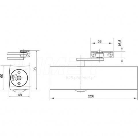 Jego funkcjonalność obejmuje także możliwość regulacji końcowej fazy zamykania, znanej jako "dobicie". Wartość siły zamykania może być dostosowana poprzez obrócenie wspornika ramienia. Zarówno końcowa faza zamykania, jak i prędkość zamykania są regulowane hydraulicznie, zapewniając optymalną kontrolę. Siła zamykania zgodna z normą PN EN1154 to EN 2/4/5, gdzie wartość 2, 4 lub 5 jest ustawiana poprzez przestawienie korpusu względem osi zawiasów.