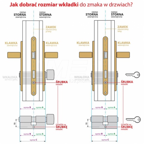 Wymiar wkładki składa się z 2 elementów składowych, np. 30/50.Oznacza to, że od czoła wkładki do środka otworu na wkręt mocujący jest 30 mm i od środka otworu na wkręt mocujący do drugiego czoła jest 50 mm. Sposób wymiarowania przedstawia rysunek obok . Ważne z tytułu bezpieczeństwa jest aby wkładka nie wystawała poza szyld od strony zewnętrznej więcej niż 3 mm. Jeśli wkładka ma posiadać gałkę to należy również określić przy którym wymiarze ta gałka ma się znajdować, np. poprzez postawienie literki "G" przy danym wymiarze - wkładka G30/50 oznacza gałkę od strony 30 mm. Ogólnie przyjętą zasadą jest podawanie pierwszego wymiaru od strony gałki.
