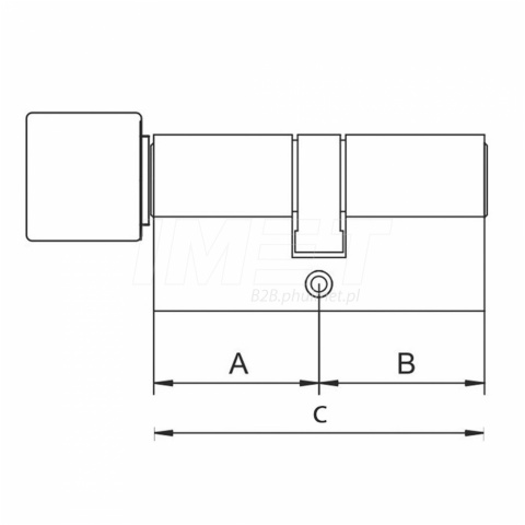 Wymiar B to odległość od środka otworu montażowego wkładki do krawędzi drzwi, po stronie zewnętrznej podana w mm (włącznie z grubością szyldu klamki).