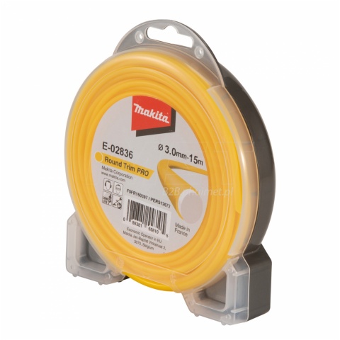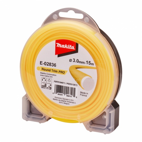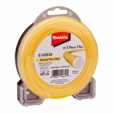 Okrągły przekrój oraz dwuwarstwowa konstrukcja żyłki Makita E-02836 zapewniają większą odporność na strzępienie i zrywanie. Model jest odpowiedni do uniwersalnego zastosowania, wykazuje wysoką skuteczność koszenia w szczególności wysokich traw i zarośli.