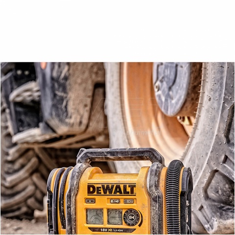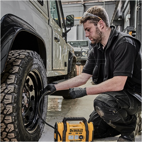 Kompresor może być zasilany z 3 niezależnych źródeł (gniazdo zapalniczki w samochodzie o napięciu 12V, akumulator DeWALT Li-Ion 18V oraz zasilacz z sieć 230V.