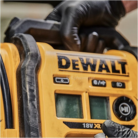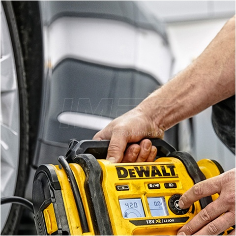 Kompresor może być zasilany z 3 niezależnych źródeł (gniazdo zapalniczki w samochodzie o napięciu 12V, akumulator DeWALT Li-Ion 18V oraz zasilacz z sieć 230V).
