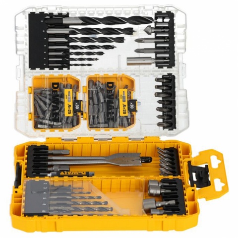 W zestawie DeWALT DT70785-QZ znajdują się wiertła do metalu Black & Gold ze stali szybkotnącej z wzmocnionym rdzeniem, antypoślizgowym trzpieniem i końcówką Speed Tip dla szybkiego i precyzyjnego wiercenia, wiertła piłkowe i spiralne do drewna z ukosowaną końcówką pilotującą, grubym stalowym trzonem i precyzyjnym prowadzeniem, a także końcówki wkrętakowe z zoptymalizowaną geometrią, kompaktowym kluczem nasadowym oraz uchwytem z prowadnicą, zapewniającym lepszą kontrolę w ciasnych przestrzeniach.