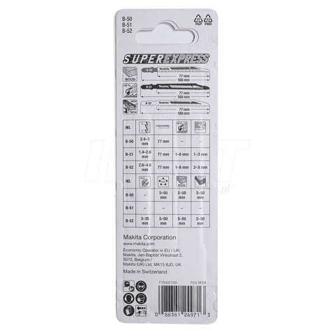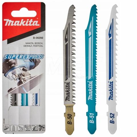 Komplet brzeszczotów do wyrzynarki Makita B-06292 to zestaw trzech ostrzy (B-50, B-51, B-52) o długości całkowitej 100 mm i długości roboczej 77 mm, przeznaczony do cięcia różnych materiałów, takich jak drewno, PVC, metal czy stal nierdzewna.