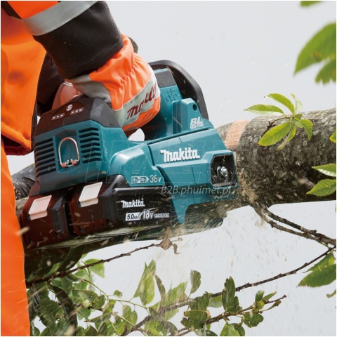 Akumulatorowa pilarka łańcuchowa Makita DUC306PT2B wykorzystuje zaawansowany system zasilania 2x18V, który generuje łączną moc 36V z dwóch akumulatorów połączonych szeregowo. Wydajny silnik bezszczotkowy BL pozwala na osiągnięcie prędkości łańcucha na poziomie 20 m/s i zapewnia wydajność pracy zbliżoną do urządzeń spalinowych. Konstrukcja należy do profesjonalnej linii LXT i została wzbogacona o technologię XPT, która gwarantuje podwyższoną odporność na pył oraz wilgoć w trudnych warunkach terenowych.