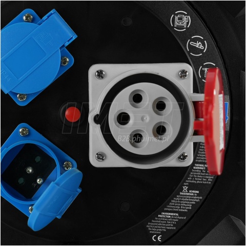 - Posiada 2 gniazda 230 V z uziemieniem (2P+Z) i 1 gniazdo siłowe 400 V