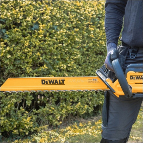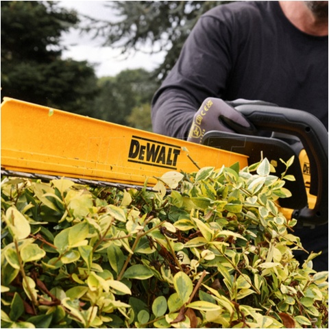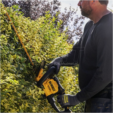 Akumulatorowe nożyce do żywopłotu DeWALT DCMHT567N-XJ to wydajne narzędzie z serii 18V XR przeznaczone do przycinania i formowania żywopłotów oraz krzewów. Urządzenie zostało wyposażone w nowoczesny silnik bezszczotkowy. Zapewnia on wysoką efektywność pracy. Wpływa także na dłuższy czas działania na jednym ładowaniu. Zwiększa również trwałość całej konstrukcji. Nożyce posiadają listwę tnącą o długości 60 cm. Umożliwia ona szybkie przycinanie większych powierzchni. Rozstaw noży wynosi 25 mm. Pozwala to na cięcie grubszych gałęzi. Prędkość pracy wynosi 1600 skoków na minutę. Oferuje to sprawne i płynne działanie.