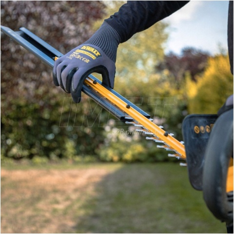 Akumulatorowe nożyce do żywopłotu DeWALT DCMHT567P1-QW to wydajne narzędzie z serii 18V XR przeznaczone do przycinania i formowania żywopłotów oraz krzewów. Urządzenie zostało wyposażone w nowoczesny silnik bezszczotkowy. Zapewnia on wysoką efektywność pracy. Wpływa także na dłuższy czas działania na jednym ładowaniu. Zwiększa również trwałość całej konstrukcji. Nożyce posiadają listwę tnącą o długości 60 cm. Umożliwia ona szybkie przycinanie większych powierzchni. Rozstaw noży wynosi 25 mm. Pozwala to na cięcie grubszych gałęzi. Prędkość pracy wynosi 1600 skoków na minutę. Oferuje to sprawne i płynne działanie.