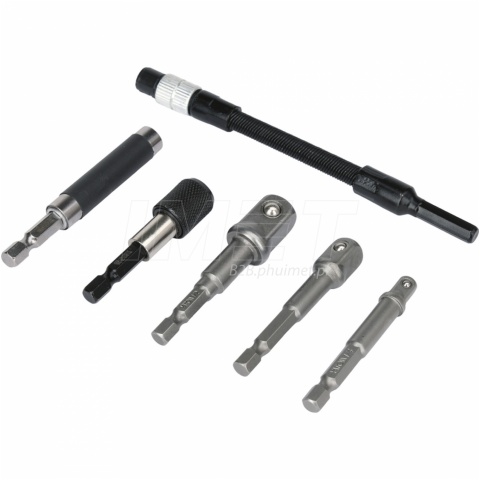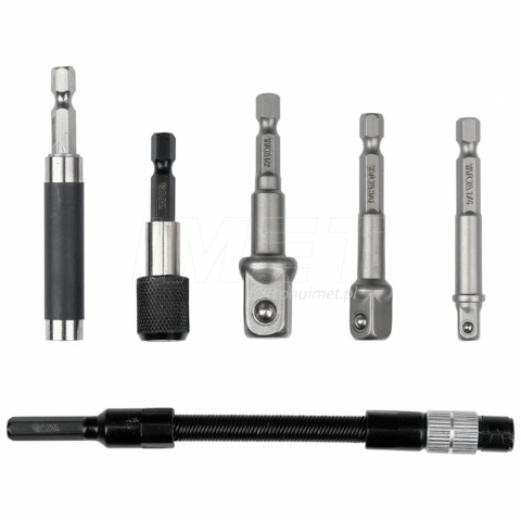 W skład zestawu YATO YT-04640 wchodzą trzy adaptery HEX o długości 65 mm do nasadek o różnych rozmiarach, uchwyt do bitów 60 mm umożliwiający szybką wymianę końcówek, uchwyt z tuleją blokującą 80 mm zapewniający pewniejsze mocowanie oraz elastyczna przedłużka 150 mm pozwalająca na pracę w trudno dostępnych miejscach i pod kątem.