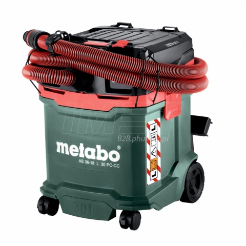 Metabo AS 36-18 L 30 PC-CC 602073850 to profesjonalny odkurzacz akumulatorowy 18 V przeznaczony do prac warsztatowych i budowlanych. Odkurzacz oferuje dużą mobilność dzięki pracy bezprzewodowej oraz pojemny zbiornik 30 litrów umożliwiający długą pracę bez opróżniania. Urządzenie obsługuje zarówno zanieczyszczenia suche, jak i mokre, posiada filtrację klasy L do standardowych pyłów. Posiada funkcje zwiększające wygodę i efektywność pracy, takie jak system automatycznego uruchamiania z elektronarzędziem (CordlessControl), ręczne czyszczenie filtra PressClean oraz tryby Eco i Boost. Wersja BODY sprzedawane jest bez akumulatorów i ładowarki, co czyni je idealnym wyborem dla użytkowników korzystających już z systemu baterii 18V Metabo CAS.