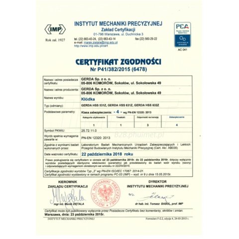Kłódka atestowana GERDA posiada niklowany pałąk ze stali hartowanej, zwiększający odporność na próby ukręcania, zerwanie lub przecięcia.