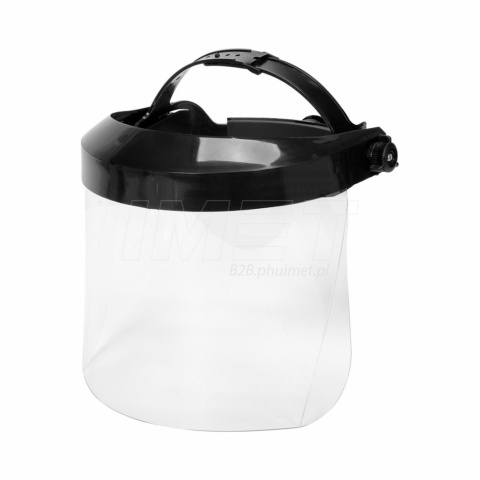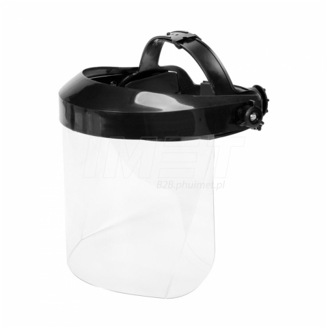 - Ma pole ochrony o wymiarach 200x350 mm, zapewniając szerokie zasłonięcie twarzy i oczu